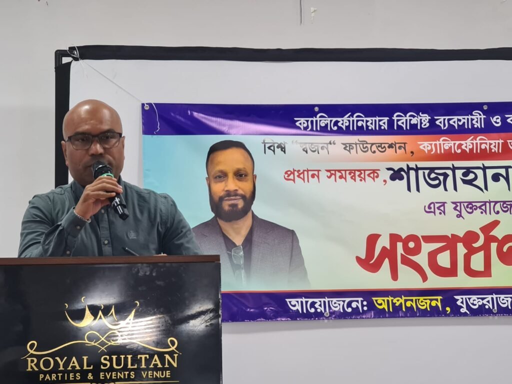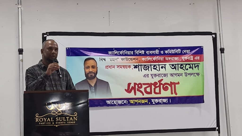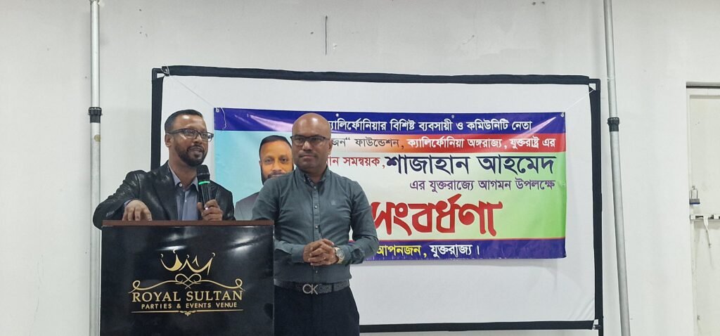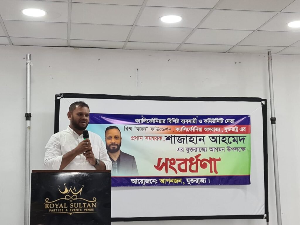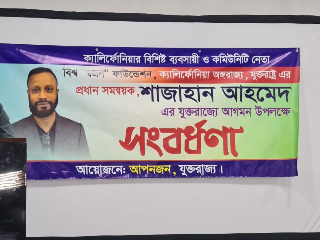 ক্যালিফোর্নিয়ার বিশিষ্ট ব্যবসায়িক কমিউনিটির নেতা ও বিশ্ব “স্বজন” ফাউন্ডেশন, ক্যালিফোর্নিয়া অঙ্গরাজ্য, যুক্তরাষ্ট্রের প্রধান সমন্বয়ক শাজাহান আহমেদের যুক্তরাজ্য আগমন উপলক্ষে এক মনোজ্ঞ সংবর্ধনা অনুষ্ঠিত হয়েছে।